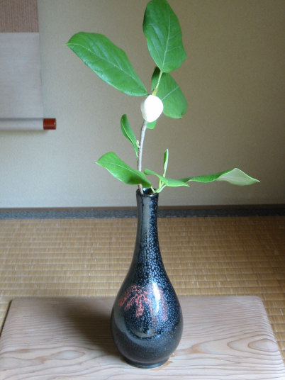 大山蓮華の蕾が輝いていました。高貴な花には唐物の花器が相応しいと思い天目釉の鶴首を用意しました。敷板は間違えて木地を使ってしまいました。